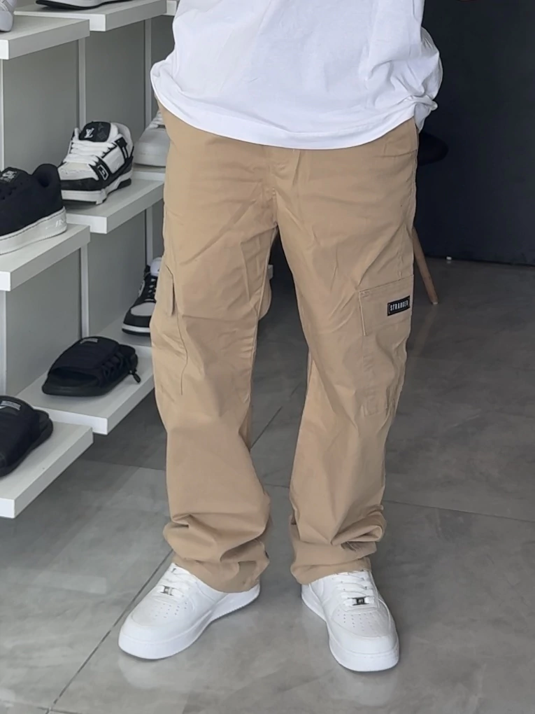 Calça produzida em tecido sarja 100% algodão e corte reto (sem elástico na barra). Possui 6 bolsos sendo, nas laterais, na altura dos joelhos e traseiro, possui cordão de ajuste na cintura e logo em silk screen.